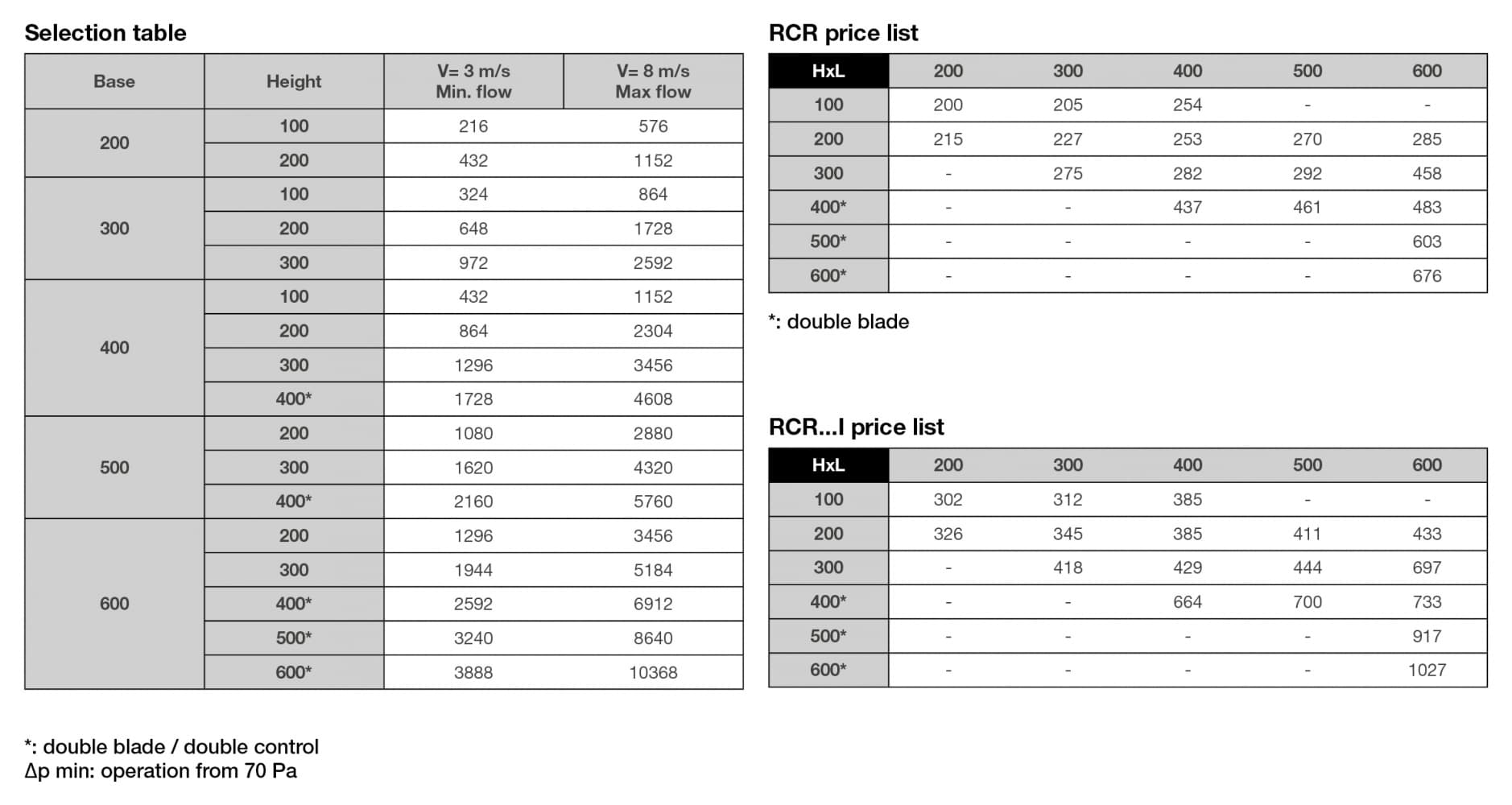 selection table and list prices